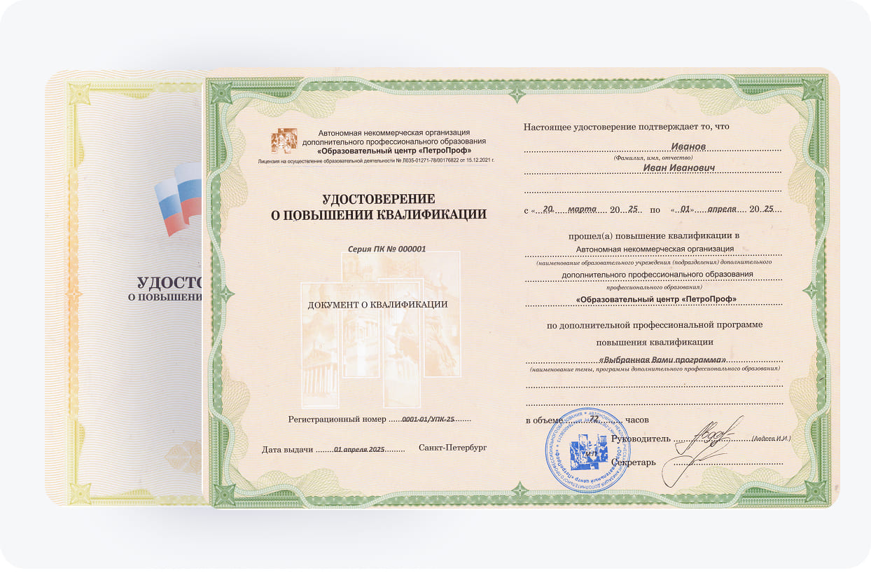 По завершении онлайн-курса наши выпускники получают удостоверение о повышении квалификации (УПК). Это документ об образовании, подтверждающий освоение образовательной программы и дающий право на продолжение проф. деятельности в нефтегазовом секторе. Важно отметить, что учебный центр «ПетроПроф» обладает официальной лицензией на образовательную деятельность.